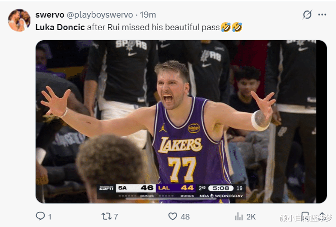 第二节东契奇给八村垒传了一个精彩的长传,结果八村垒篮下轻松的放篮没中,东契奇朝着八村做了一个鬼脸表示不满。