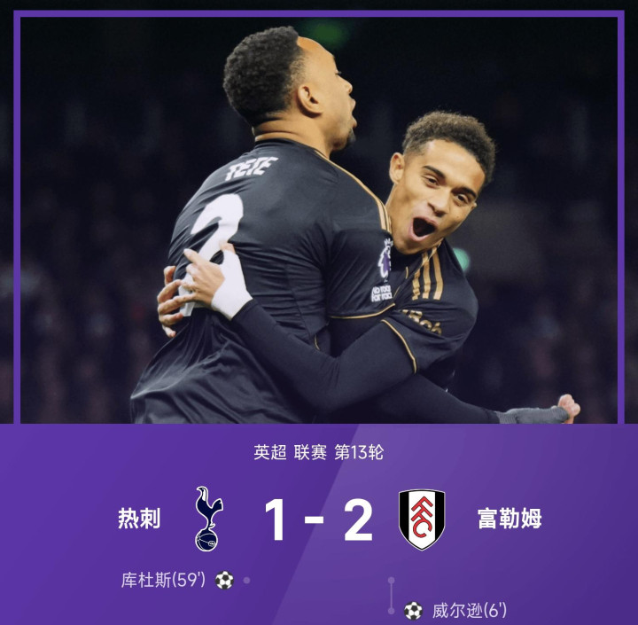 25/26赛季英超联赛第13轮,富勒姆2-1战胜热刺。全场比赛,泰特开场闪击破门,维卡里奥出击送礼,威尔逊吊射空门得手,库杜斯下半场爆射破门难救主,热刺主场连续六场不胜。富勒姆取得各项赛事客场首胜。积分榜方面,热刺18分第10,富勒姆17分第15。
