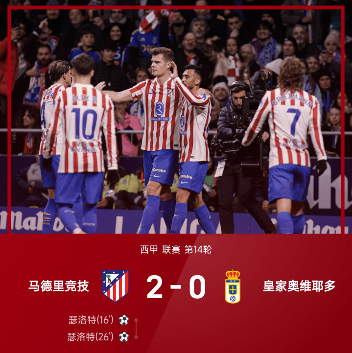 25/26赛季西甲联赛第14轮,马德里竞技2-0战胜皇家奥维耶多。全场比赛,瑟洛特上演梅开二度后被换下,埃斯坎德利单场贡献4次神扑难救主,汉茨科送助攻,马竞西甲六连胜&各项赛事豪取七连胜,下轮将战巴萨。在积分方面,马竞31分仅仅落后皇马1分杀入前三。
