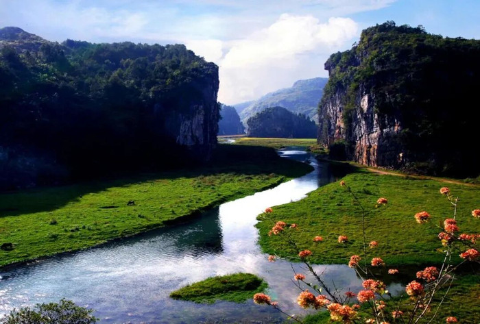这里自然景观独特,拥有一代帝陵、二湖秀水、三道岩门、四片绿洲、五座寺庙,六大飞瀑、七里峡谷、八面险景、百个奇洞、千块巧石、万树腊梅等景观,是一处集自然风光为主体,岩溶地质遗迹为特色的综合性景区。