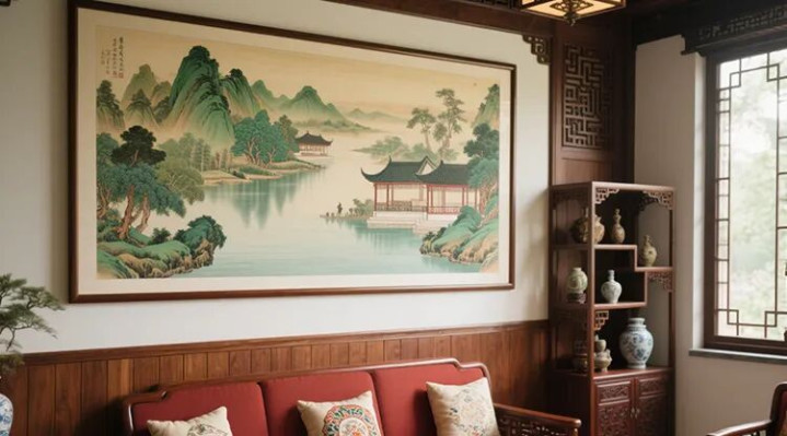 悬挂山水画:选择一幅高山流水图,注意山体宜宽厚稳重,位居画面后方,避免水流向画外。