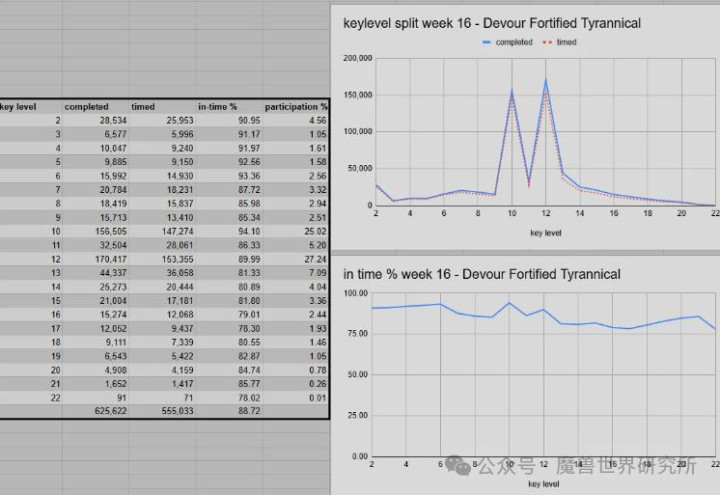 钥石等级分布呈现明显的 “下沉趋势”:79.86% 的完成量集中在 10 级及以上,但 10 级钥石占比高达 25%,12 级钥石以 27.24% 成为最热门等级;而 12 级以上的高等级钥石参与量不足一半,且等级越高,参与量增长越趋于停滞。