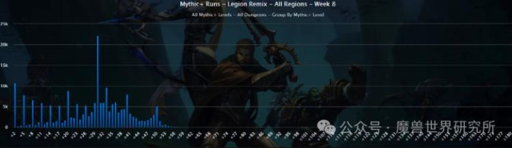 幻境新生的钥石等级分布同样呈现 “低走” 特征:仅 74.27% 的运行量集中在 20 级及以上,较此前明显下滑。30 级钥石占比从 11.15% 降至 10.80%,40 级从 4.26% 降至 3.87%,50 级从 2.81% 降至 2.50%,高层数参与度的持续萎缩,表明玩家对该模式的装备奖励已失去兴趣。如今,“1 小时内全通英雄难度团本” 成为效率玩家的首选升级方式,而幻境新生的核心吸引力仅剩外观幻化。