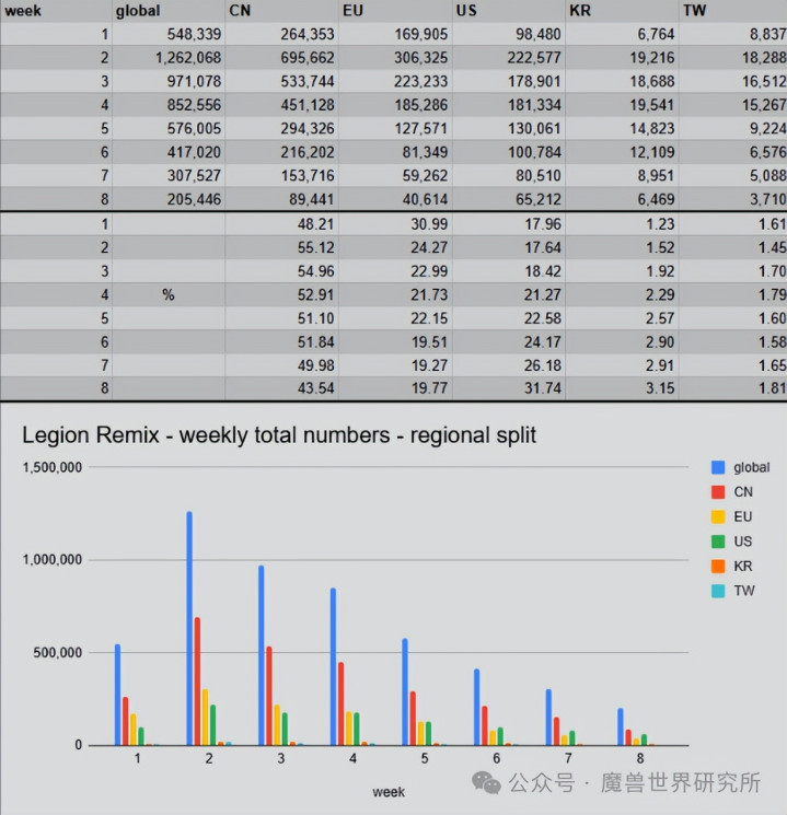 从数据关联来看,泰坦服务器上线后,国服正式服的史诗钥石、军团再临幻境新生等核心模式均出现 “断崖式下跌”:军团再临幻境新生本周全球活跃度下降 33.19%,而国服降幅高达 41.81%,远超全球平均水平;反观其他地区,美国玩家对该模式的粘性相对较高,有望在其末期成为主要参与群体。