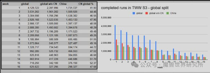 更能反映国服颓势的是玩家活动占比变化:上周国服玩家在全球史诗钥石活动中占比 52.37%,本周直接跌至 47.68%,而与第 14 周相比,国服参与量已累计缩水三分之一。