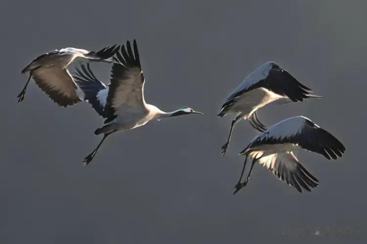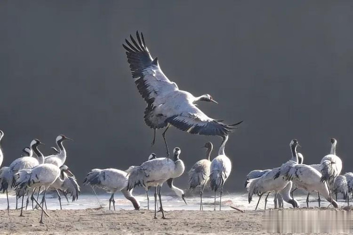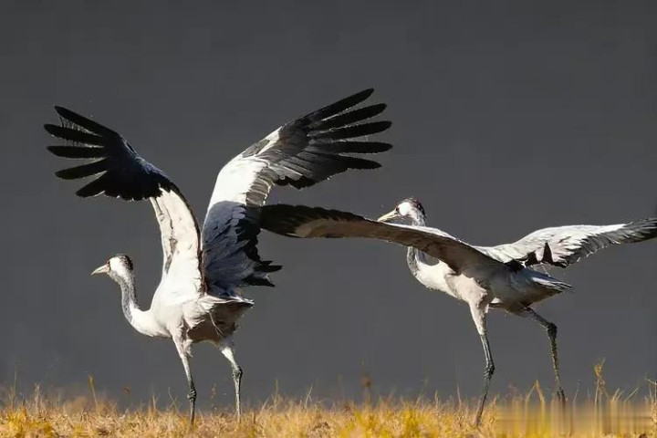 紧接着,又有两只灰鹤加入进来,它们或单足点地,旋转跳跃;或双翅齐展,相互依偎着低空飞舞。