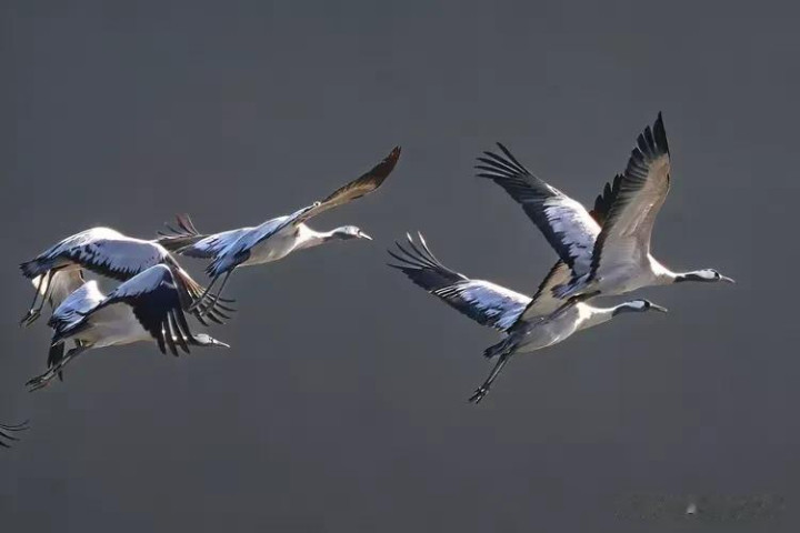 忽然,一只灰鹤似是领舞的精灵,率先展开双翅。那翅膀展开的瞬间,如同一把被缓缓打开的折扇,羽毛在阳光的照耀下,闪烁着柔和的光泽。它轻盈地跃起,修长的双腿向后伸展,整个身体在空中划出一道优美的弧线。