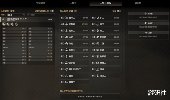 当时社区里其实玩家群体很杂,有SOC类型的老手很快适应了这套系统,觉得无需调整的,也有新手连系统的功能介绍都读不懂,玩得一头雾水的。但在1.0里,制作组真的改进了族人的AI和管理模式,通过功能更全面的工作台管理,玩家除了能更快捷的“一键分配岗位”,而且空闲的族人还能主动去“揽活干”。