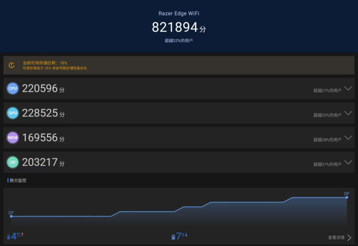 性能方面,Razer Edge的核心是骁龙G3x Gen 1芯片,其CPU和GPU架构基本等同于一代“火龙”骁龙888。在安兔兔V10测试中,它跑出了接近82万分的成绩,理论性能摆在今天,依旧能打。